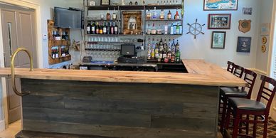Custom made this one of a kind Bar, designed in solid hard Maple top and rustic weathered Pecan panels wrapped around its base that added a touch of personality to a fine restaurant located in Santee, SC called The Captain's Quarters. Go see it for yourself and ask Paulo the owner to showoff the beautiful character of his custom made bar.